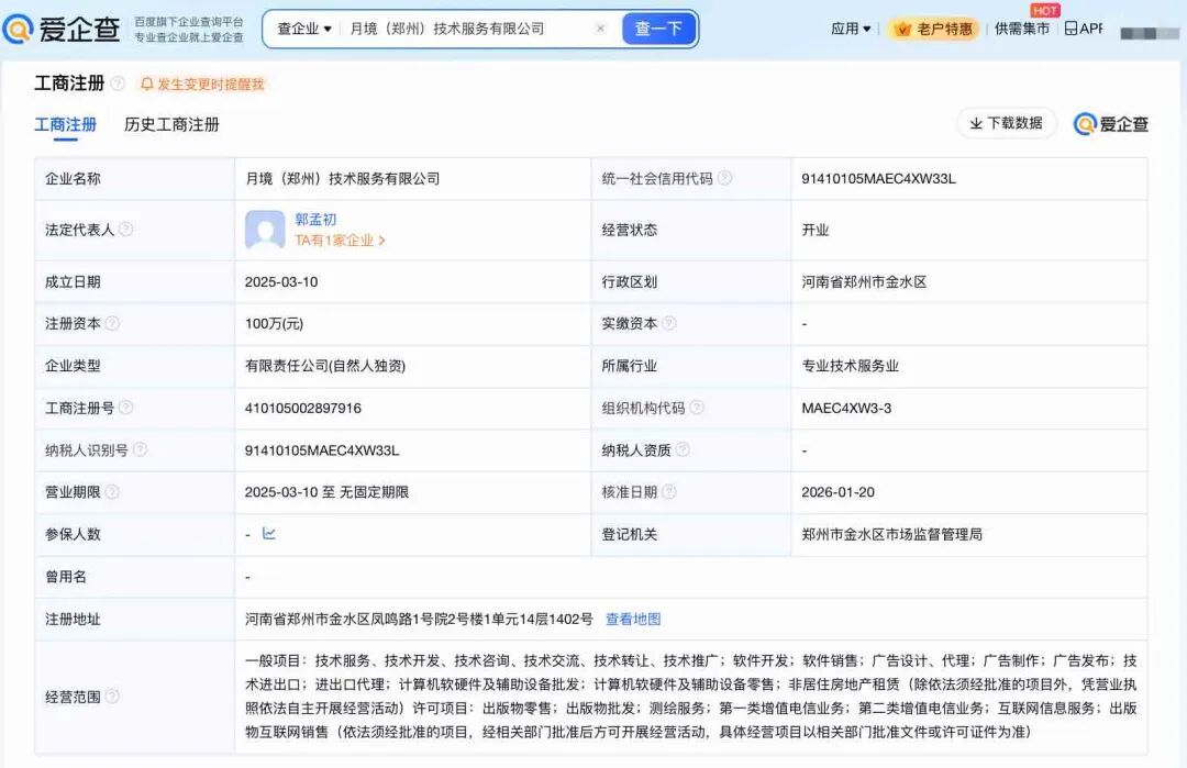 月境(郑州)技术服务有限公司成立于2025年3月,法定代表人为郭孟初,经营范围包括软件开发、软件销售、计算机软硬件及辅助设备批发、计算机软硬件及辅助设备零售、互联网信息服务、出版物互联网销售等,由郭孟初全资持股。