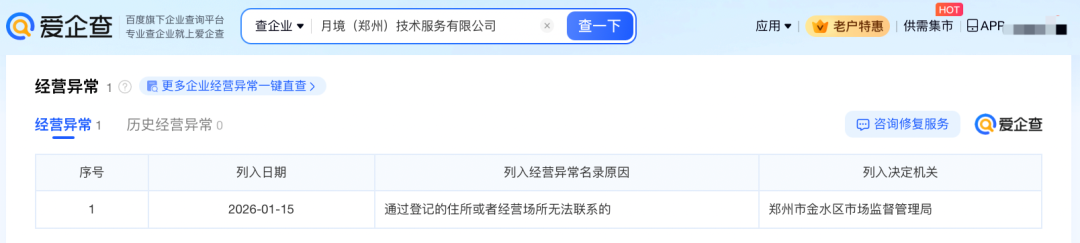 爱企查App显示,近日,月境(郑州)技术服务有限公司因通过登记的住所或者经营场所无法联系,被郑州市金水区市场监督管理局列入经营异常名录。此外,该公司注册资本由10万人民币增至100万人民币。